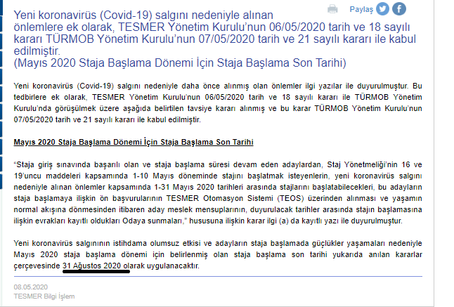 (Mayıs 2020 Staja Başlama Dönemi İçin Staja Başlama Son Tarihi) 8 Mayıs 2020 Cuma4176 ilgili haber linki : http://www.tesmer.org.tr/post/914